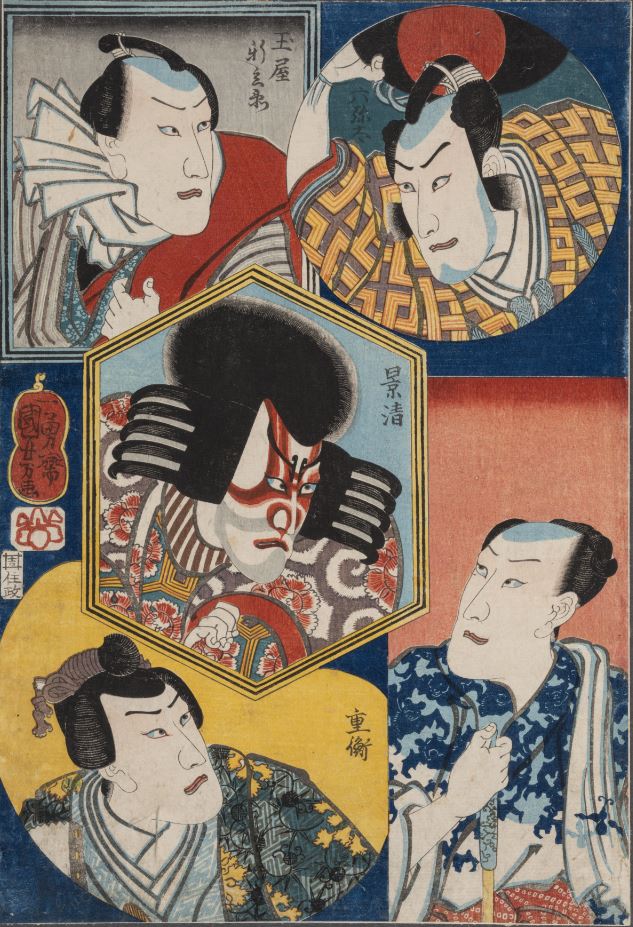 Utagawa Kuniyoshi (1797–1861), L’Acteur Ichikawa Danjuro VIII dans les rôles de Rokuyata, Tamaya Shinbei, Kagekiyo et Shigehira, 1849, gravure sur bois, 355 x 243 mm. Photographie : Julien Gremaud