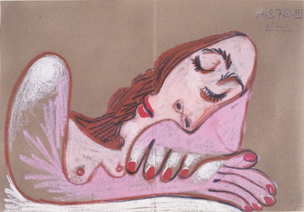 Pablo Picasso, Buste de femme endormie, 1970, crayons de couleur et pastel sur carton rainé au centre, collé sur un support de carton © Succession Picasso / 2025, ProLitteris, Zurich Photographie : Alberto Ricci, Paris